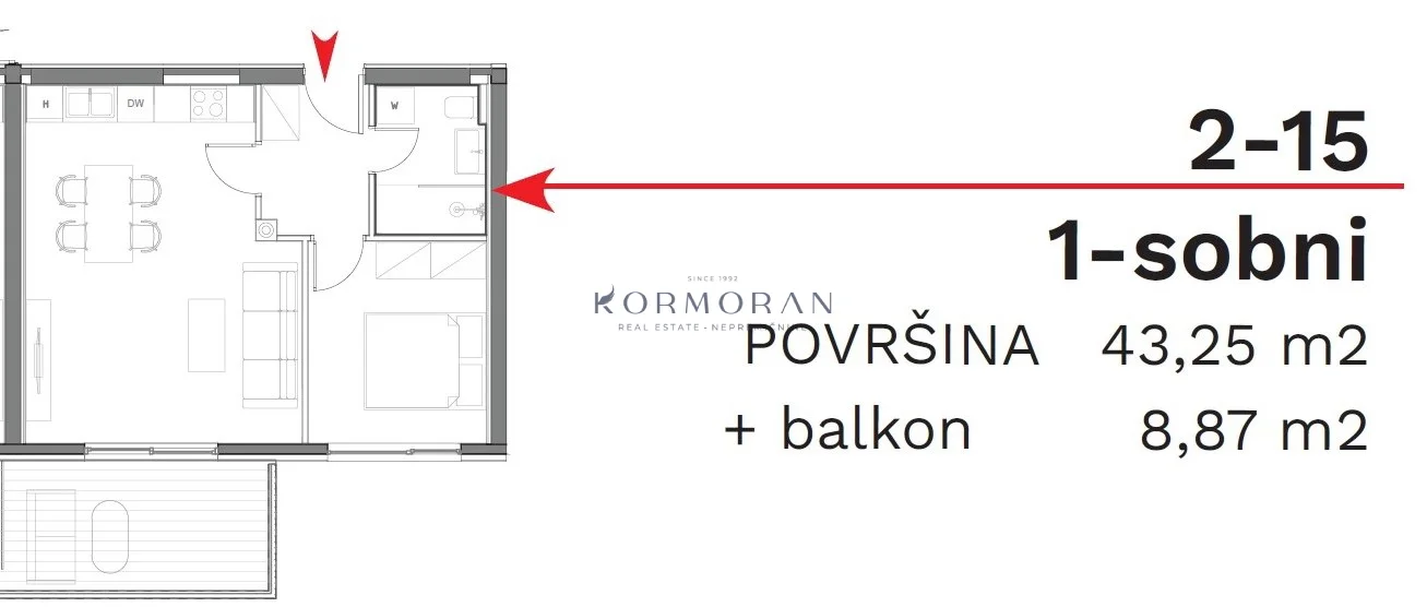 Die Wohnung besteht aus einem Schlafzimmer und einem zusätzlichen Wohnzimmer, was eine funktionale Raumaufteilung ermöglicht. Der großzügige Balkon mit einer Fläche von 8,87 m2 bietet zusätzlichen Raum zum Entspannen oder Verweilen im Freien.