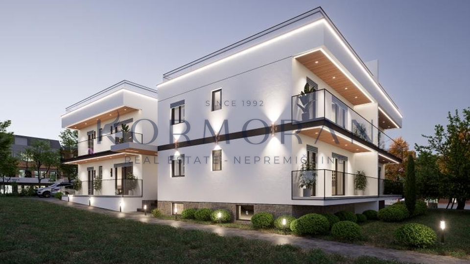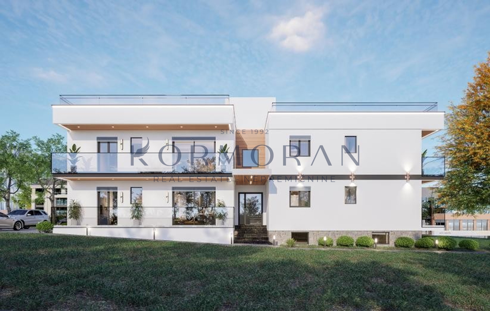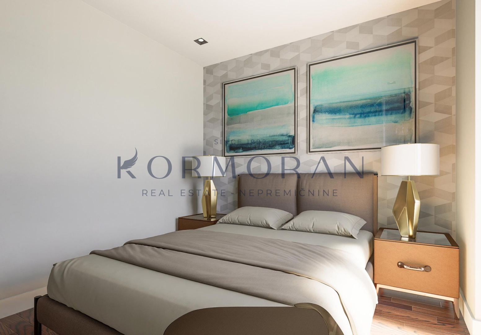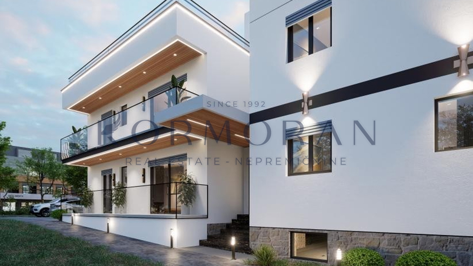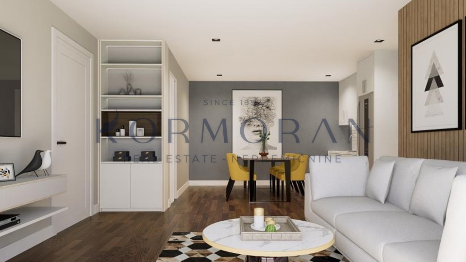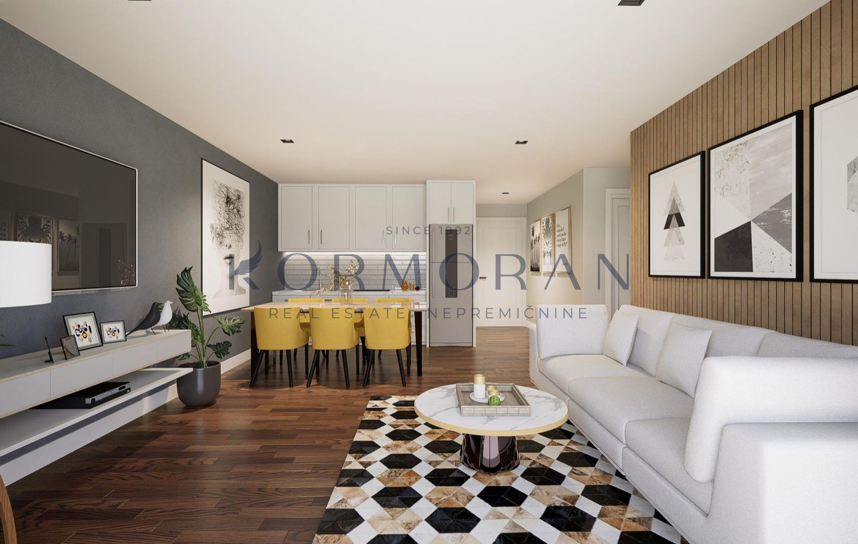 Svaki stan je poseban na svoj način i imat će pogled na more. Stan se sastoji od hodnika, dnevnog, boravka i kuhinje, 2 spavaće sobe, 2 kupaonice i terase koja iznosi 11,88m2. Raspolaže također i s podrumom od 11 m2 i svakom stanu pripada jedno parkirno mjesto te mogućnost punjenja električnog automobila. U stanu biti će podno grijanje i inverter klima( grijanje, hlađenje). Blizu objekta nalazi se: 1000 m plaža, 50 m restoran, 50 m pekara, 50 m igralište.