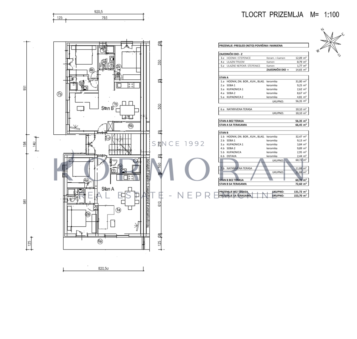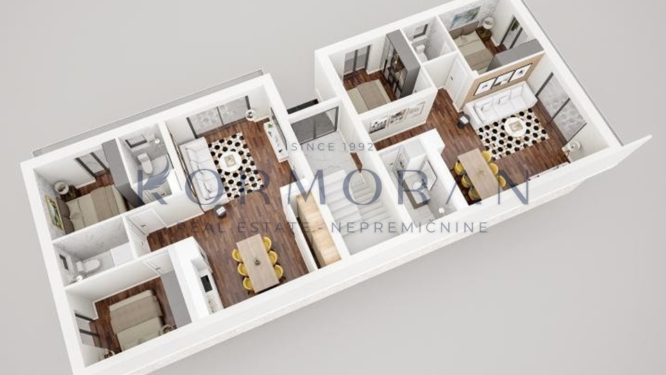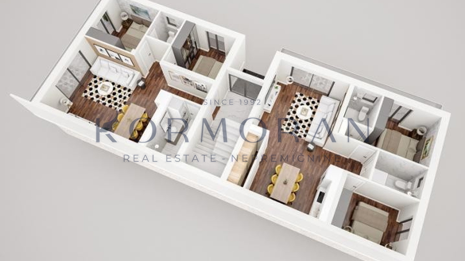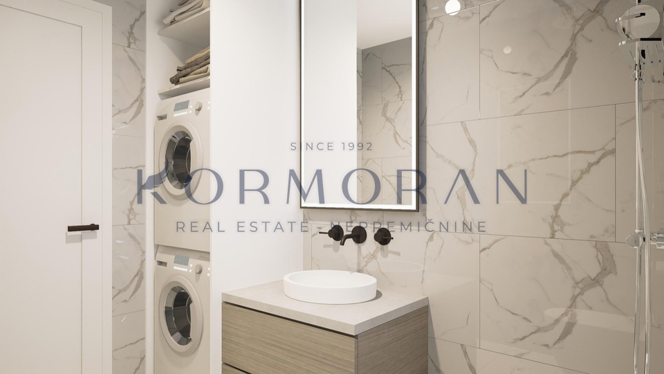 Svaki stan je poseban na svoj način i imat će pogled na more. Stan se sastoji od hodnika, dnevnog, boravka i kuhinje, 2 spavaće sobe, 2 kupaonice i terase koja iznosi 11,88m2. Raspolaže također i s podrumom od 11 m2 i svakom stanu pripada jedno parkirno mjesto te mogućnost punjenja električnog automobila. U stanu biti će podno grijanje i inverter klima( grijanje, hlađenje). Blizu objekta nalazi se: 1000 m plaža, 50 m restoran, 50 m pekara, 50 m igralište.