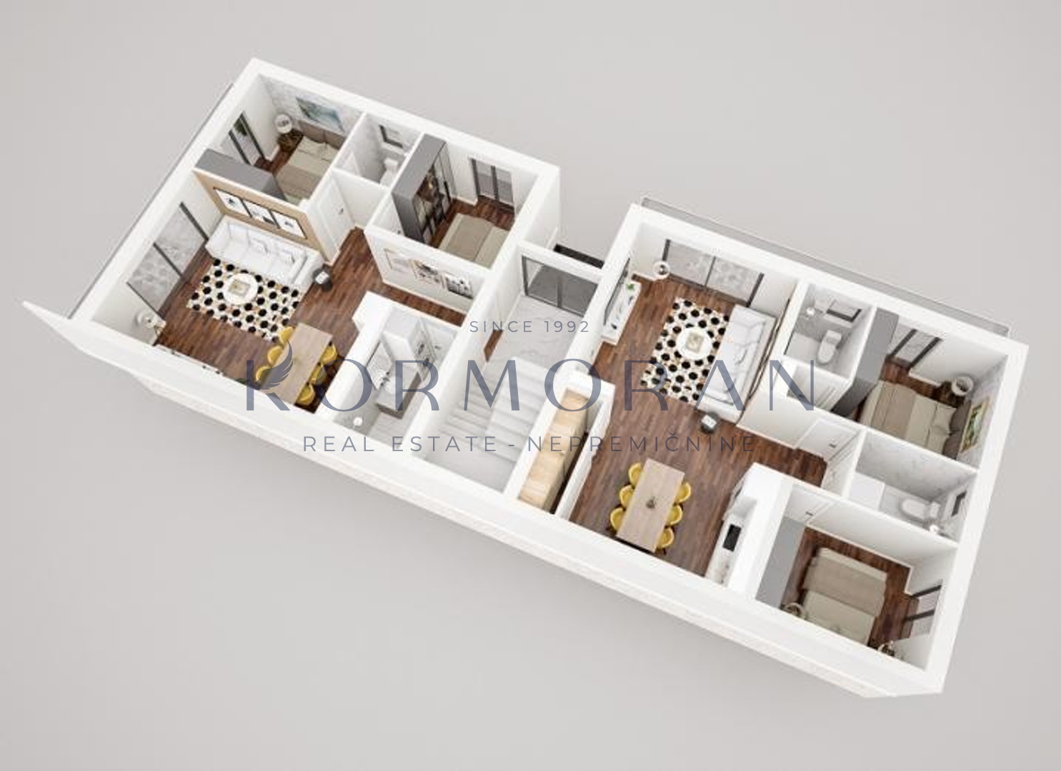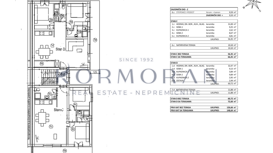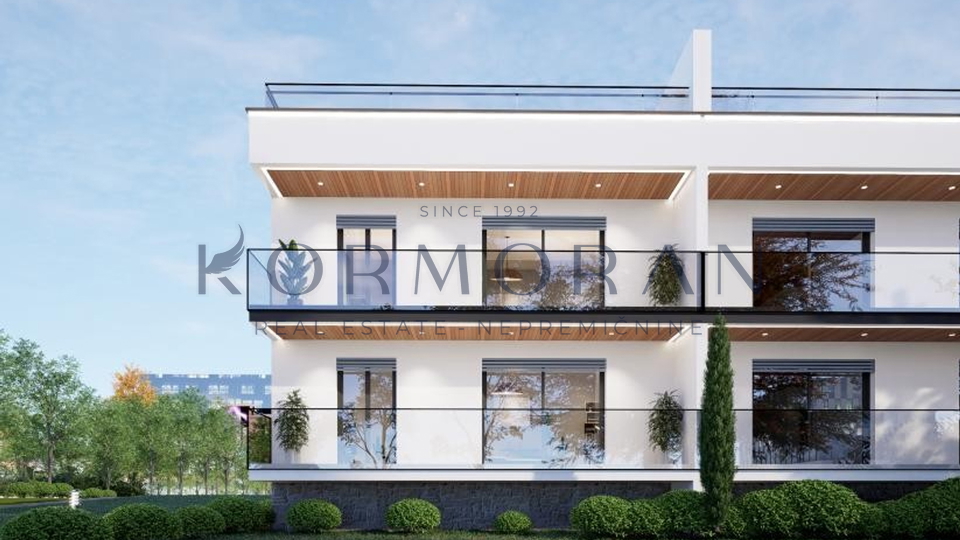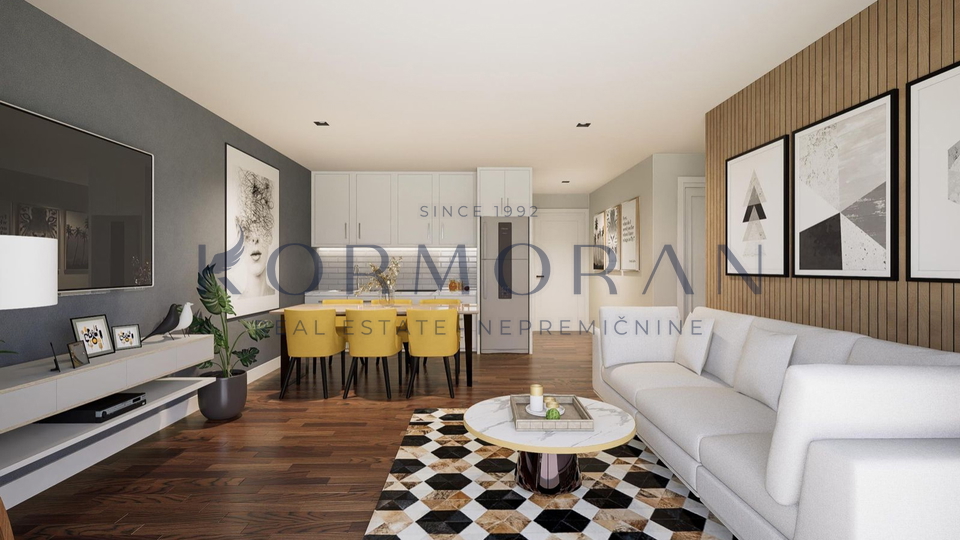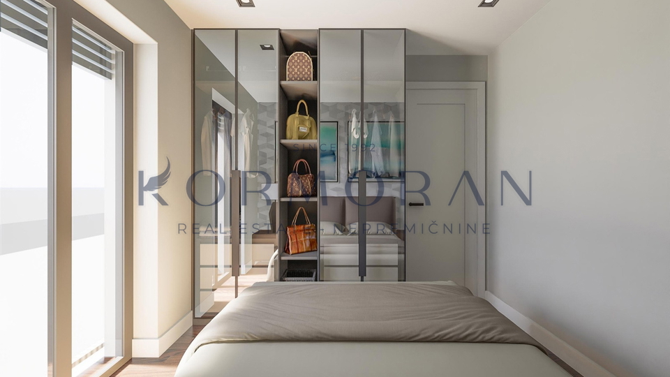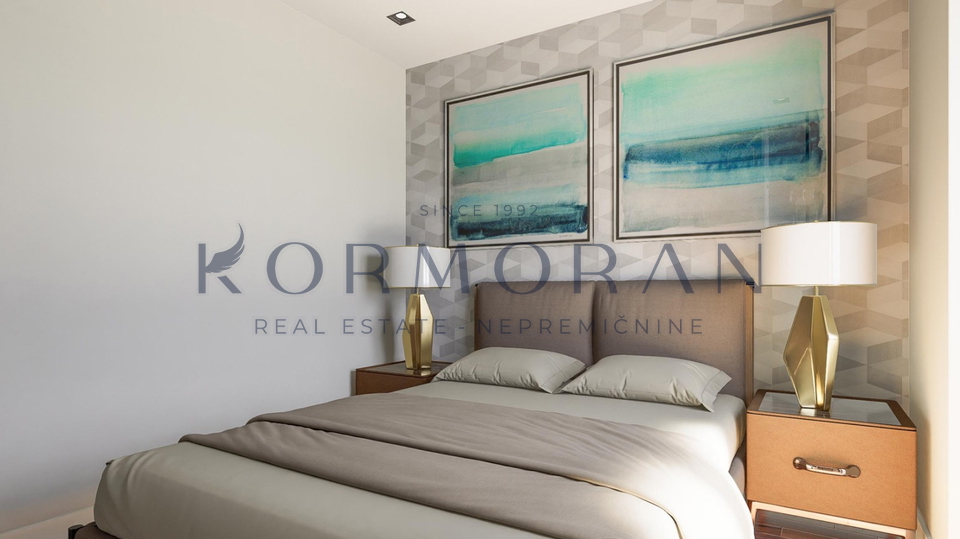 Svaki stan je poseban na svoj način i imat će pogled na more. Stan se sastoji od hodnika, dnevnog, boravka i kuhinje, 2 spavaće sobe, 2 kupaonice i terase koja iznosi 11,88m2. Raspolaže također i s podrumom od 11 m2 i svakom stanu pripada jedno parkirno mjesto te mogućnost punjenja električnog automobila. U stanu biti će podno grijanje i inverter klima( grijanje, hlađenje). Blizu objekta nalazi se: 1000 m plaža, 50 m restoran, 50 m pekara, 50 m igralište.