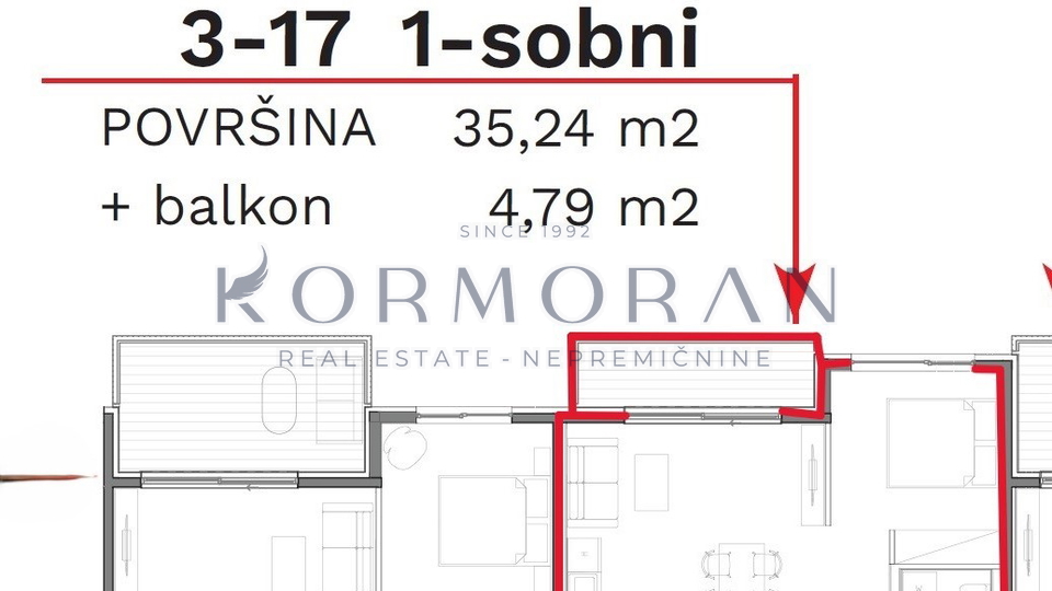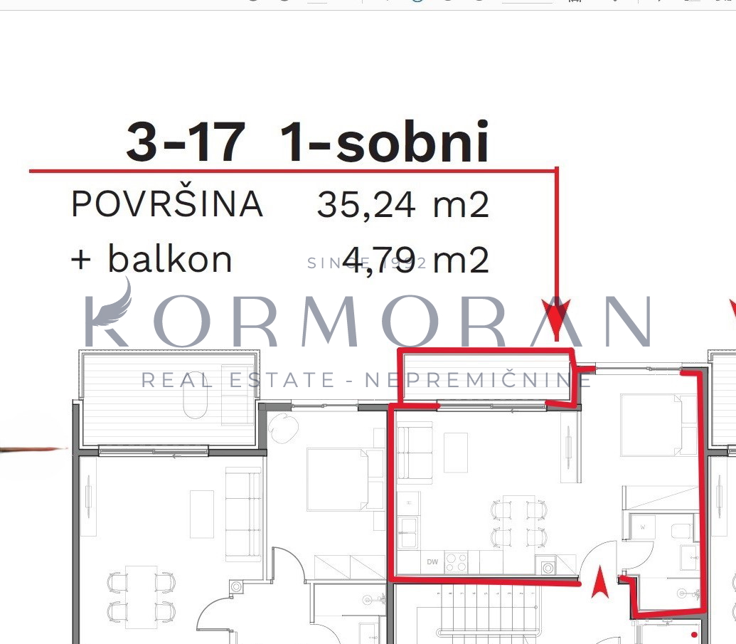 Stan odlikuje suvremeni dizajn i funkcionalna raspodjela prostora, a orijentiran je prema sjeveru. Prostrani dnevni boravak s izlazom na balkon površine 4,79 m2 pruža ugodno mjesto za opuštanje i uživanje u pogledu. Spavaća soba nudi komfor potreban za svakodnevni život.